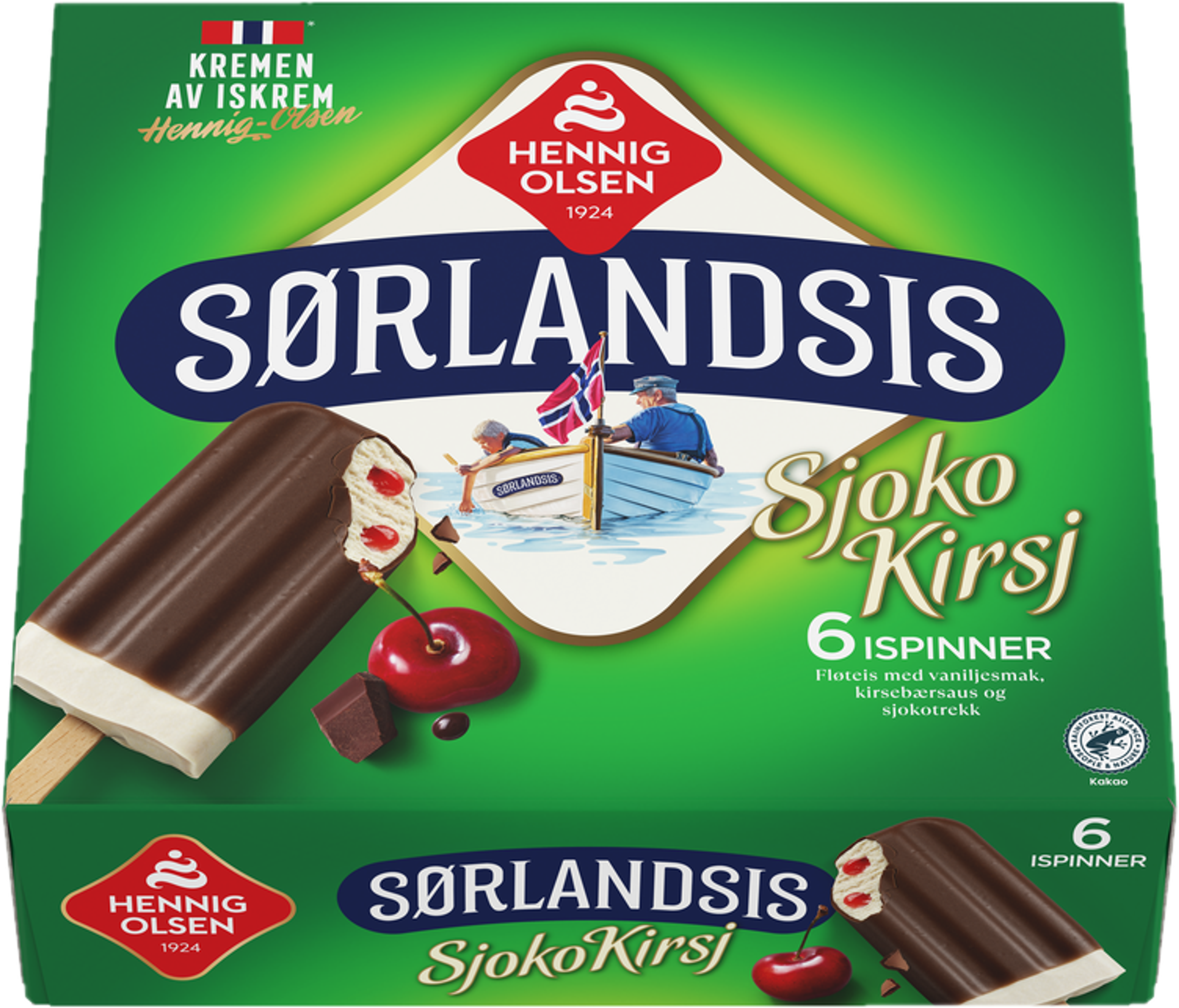 Norsk fløteis fra Sørlandet med pistasjsmak, sjokobiter og sjokoladeovertrekk. 6 ispinner med deilige sjokobiter og fløyelsmyk iskrem.