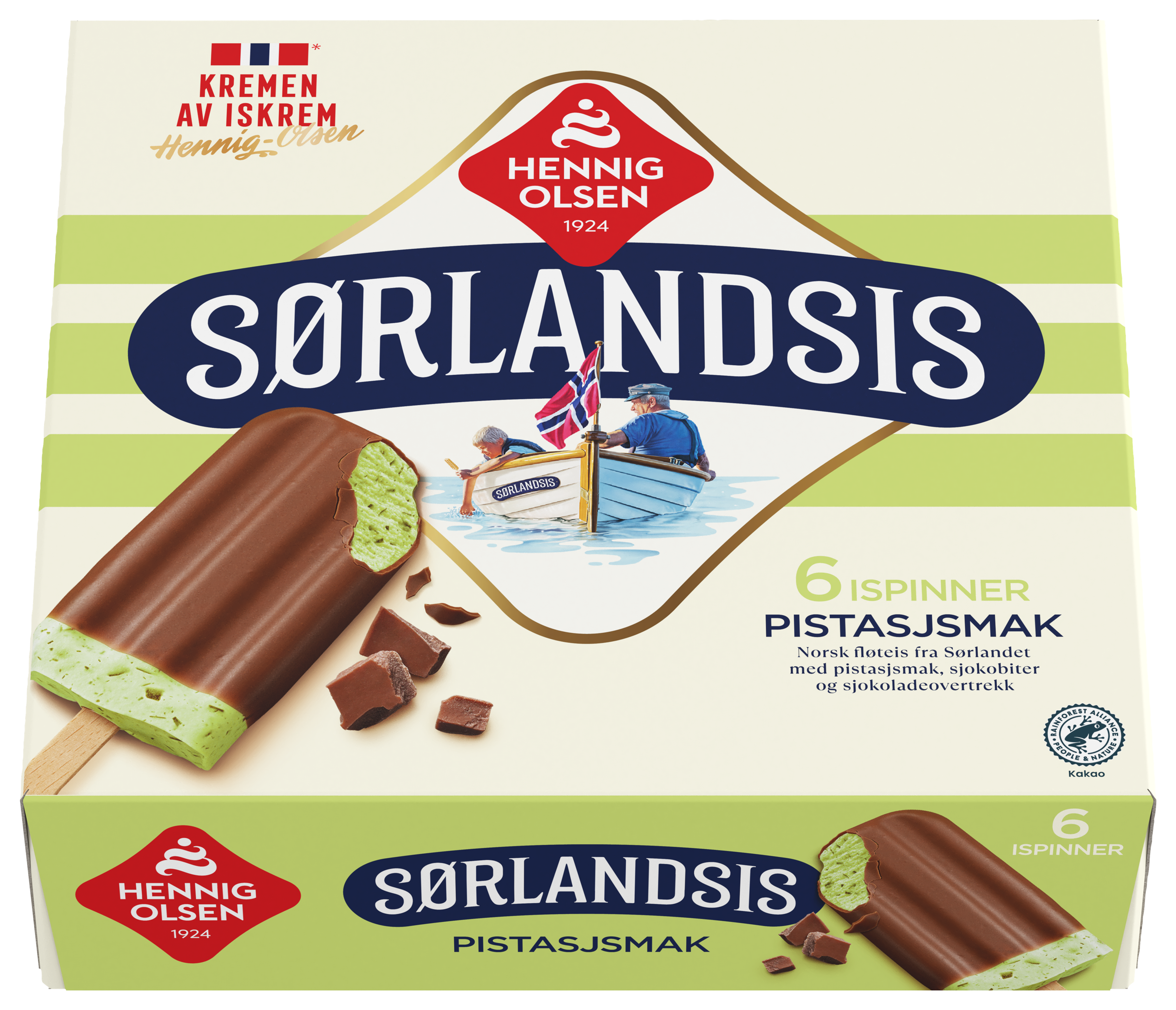 Norsk fløteis fra Sørlandet med pistasjsmak, sjokobiter og sjokoladeovertrekk. 6 ispinner med deilige sjokobiter og fløyelsmyk iskrem.