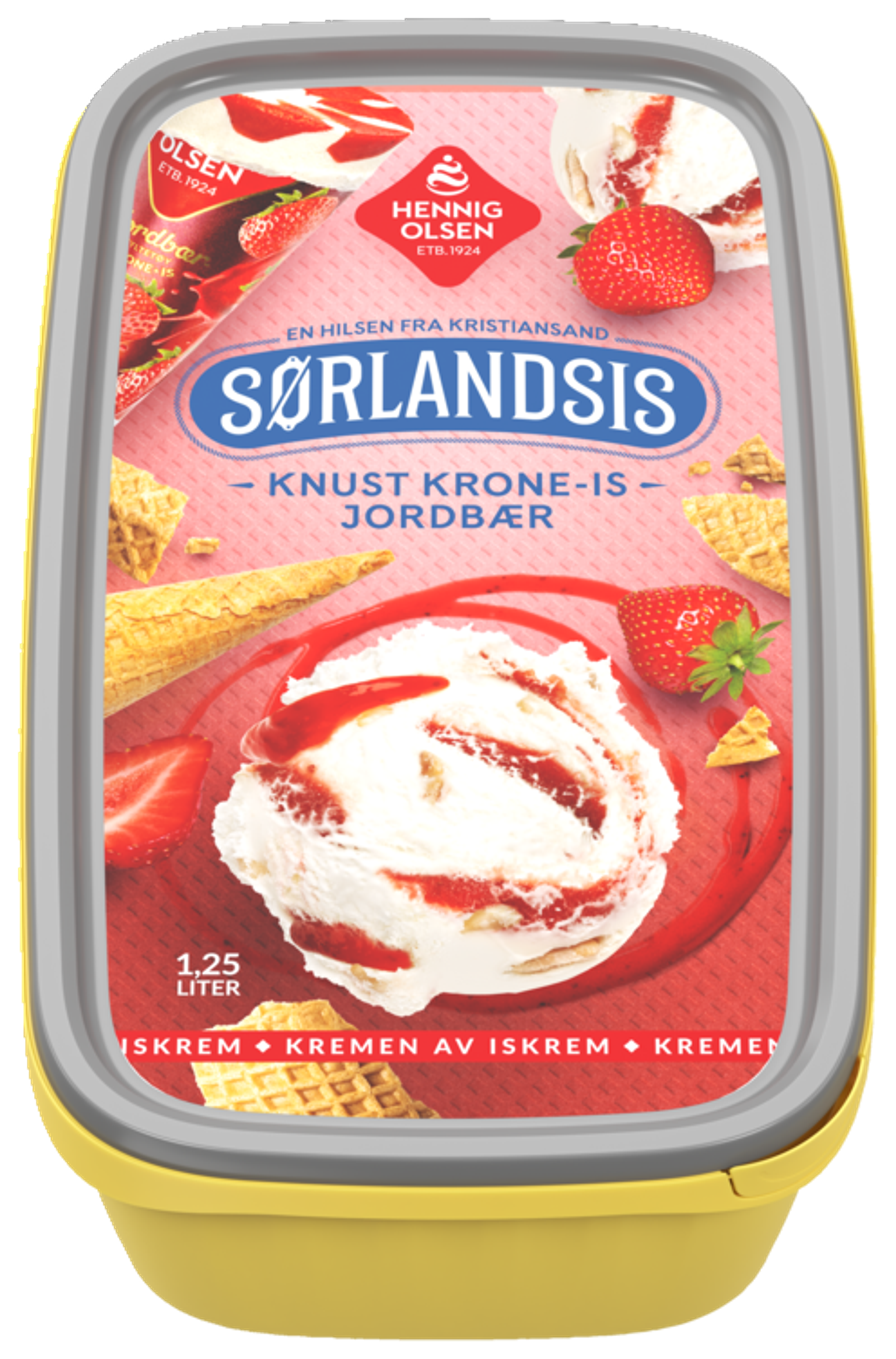 Sørlandsis Krone-is Jordbær er en deilig fløteis med den kjente vaniljesmaken, jordbærsyltetøyet og kjeksbiter fra Hennig-Olsen Krone-is.